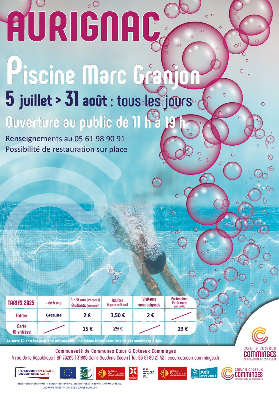 La piscine d’Aurignac ouvre ses portes au public du samedi 5 juillet au 31 août 2025 de 11 h à 19 h non stop.