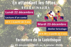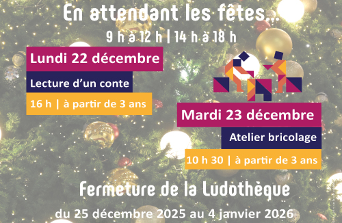 Du22déc.à23déc. Ludothèque de Boulogne-sur-Gesse Maison des services4 boulevard Raymond Bergougnan 31350 Boulogne-sur-Gesse Animation En attendant les Fêtes En savoir plus, cliquez sur l'afficheFermeture de la ludothèque du 25 décembre 2025 au 4 janvier 2026. Choix du plan Fermer PrécédentRetour à la listeSuivant