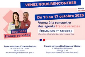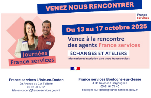 Du13oct.à17oct. Service à la population Journées France servicesBoulogne-sur-Gesse et L'Isle-en-Dodon En savoir plus PrécédentRetour à la listeSuivant